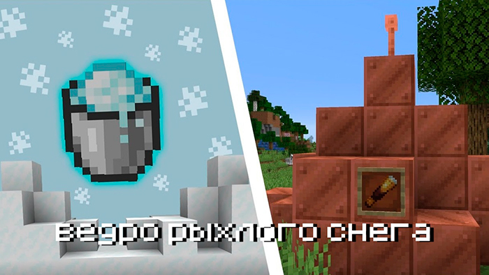 Рыхлый снег в Minecraft PE 1.17.0.0 , 1.17.0 и 1.17.10 можно набрать в ведро. После это его можно переместить в котел для наполнения. Травяная дорожка в MCPE 1.17.0.0 , 1.17.0 и 1.17.10 создается при помощи лопаты не только на земле, но и на: